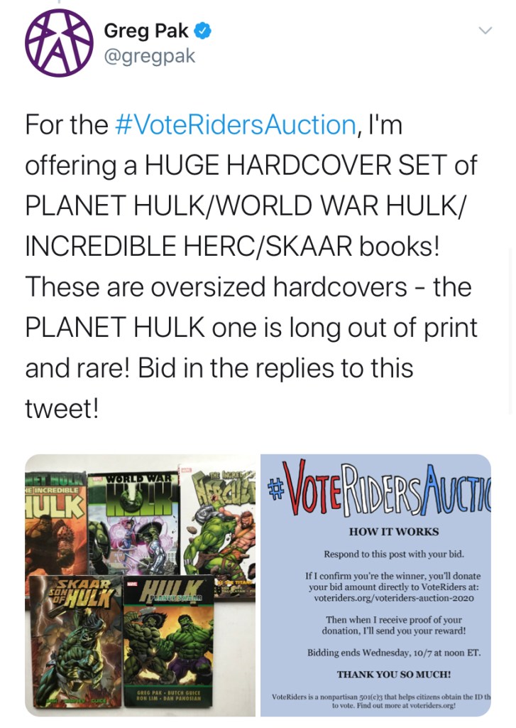 “I’m enormously grateful for all the amazing creators and bidders who came together during such an overwhelming week in an overwhelming year to help raise money to help people get the ID they need to vote. It shows how much people care about the right to vote and how important it is to support it.” – Greg Pak
