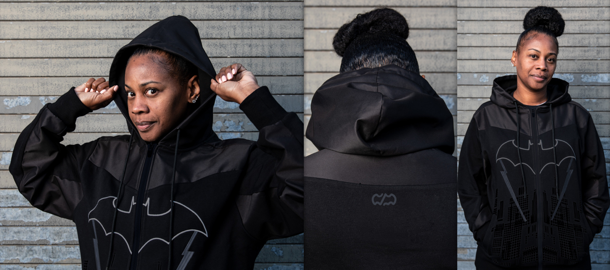 Batman Heritage Retro Bomber Jacket: This custom-tailored jacket features a chenille patch, embroidered stitching and more. Batman Tech Hoodie: Featuring a direct embroidered Batman logo placed over a tonal black-on-black cityscape screen-print. Batman Retro Black Heather T-Shirt:Featuring a distressed soft hand water-based screen print.