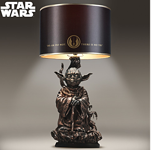 | This exclusive collectible STAR WARS Yoda lamp from The Bradford Exchange features: Set the wisdom of Jedi Master Yoda™ aglow with the Jedi Master Yoda Desk Lamp, available only from The Bradford Exchange ![]() Officially licensed by Lucasfilm Ltd. This Yoda collectible lamp showcases a museum-quality cold-cast bronze sculpture befitting his heroic stature, the fully-sculpted Master Yoda base gleams with hand-applied finishes to enhance subtle details in his appearance and robe Textured cloth lamp shade features a golden lining to reflect radiance downward and illuminates the words “DO. OR DO NOT. THERE IS NO TRY” along with the Jedi Order Logo UL approved; includes 1 FREE energy efficient light bulb for soft illumination and immediate enjoyment Edition limited to 295 casting days, so order now! Hand-numbered Certificate of Authenticity Measures 22″ H; 55.9 cm H |