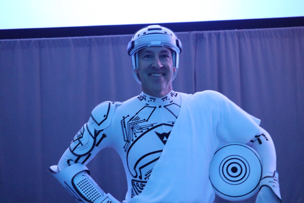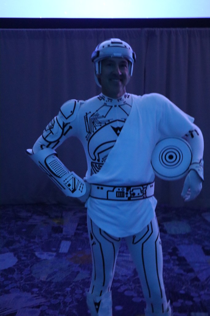 The panelists included Carol Green (DGA), Bruce Boxleitner (Tron actor) , Scot Drake, Donald Kushner (producer) , Mike Bonifer (producer). Tron was a pioneer in Vfx special effects and was the first film to really use computer simulated models. Producer Donald Kushner recalled selling the idea of Tron to Disney and getting it green-lit. The visual effects supervisor Richard Winn Taylor II recalled the making of the suit and using a white motocross helmet and inventing things along the way. The handmade TronĀ suit was showcased by David Fleming with his replica Tron prop costumeĀ Ā during the panel (iotower.com) John Scheele, the films effects technical supervisor had the crowd cracking up as he spoke about airbrushing the unanticipated glowing effects from the actors buttocks during filming.