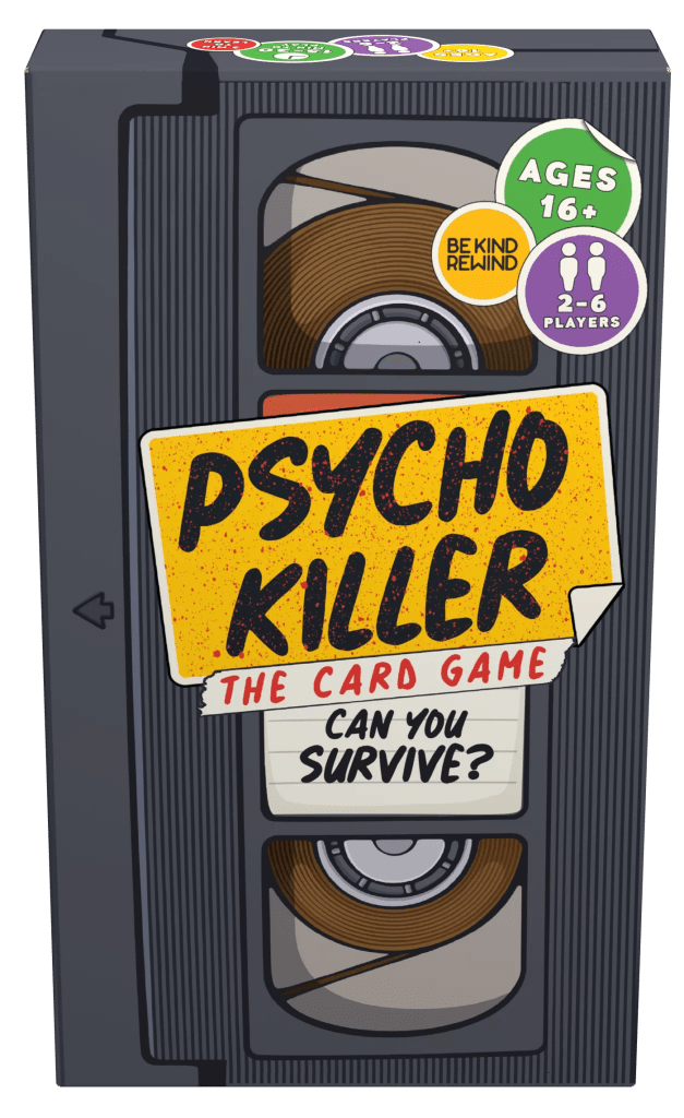 You can run, but you can’t hide from the PSYCHO KILLER! Looming in the deck, along with every cliché horror trope you can think of, is the dreaded Psycho Killer. Use your cards to avoid his wrath with boobytraps, outwit his fury with clever defensive measures, or leave your fellow players for dead. When he shows up, he’ll hack and slash his way through you and your friends! The player who’s taken the least amount of damage after he shows up five times wins. Recommended for 2-6 players, ages 16 and up.