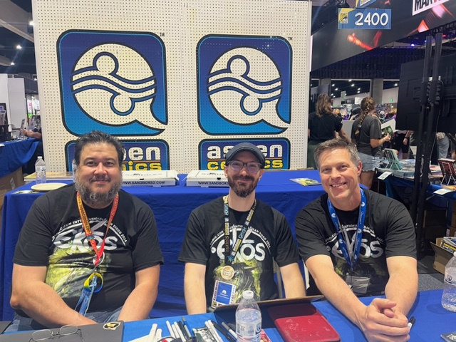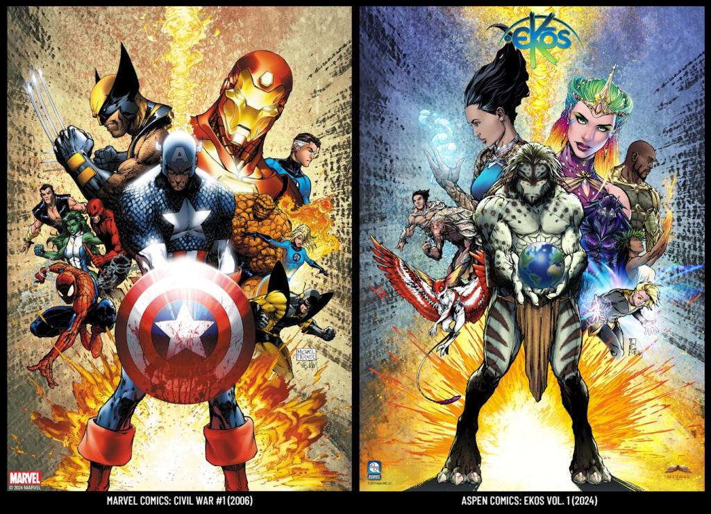 EKOS VOLUME 1 will comprise Ekos’ first three comics including Ekos #1 that, compiled together, make up a 128 pg graphic novel. In this unique approach, both formats will be available together side by side exclusively on Kickstarter, with the Kickstarter campaign launching September 10, 2024. The Kickstarter pre-launch page went live just before the convention with fans already pouring in to follow the campaign, to be alerted of campaign updates, and to receive an exclusive digital print of an homage to Marvel’s Civil War 1 variant cover by Michael Turner that includes the main Ekos characters. These prints were available as a physical giveaway to those who came by the Aspen booth at Comic-Con, with over 5,000 distributed throughout the convention.