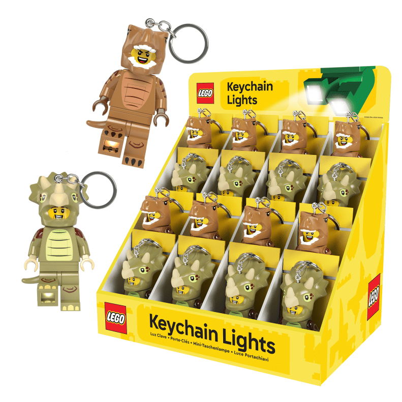 Unleash your love for dinos with the LEGO Dinosaurs 16-count CDU. Perfect for fans of prehistoric creatures and quirky collectables. The Keychain Light figure measures approximately 76mm (3 inches) tall and is a 175% scale replica of the LEGO minifigure. Powered by 2 CR2025 batteries (included), simply hold the on/off button in the chest to activate the LED light in each foot. The metal key ring is easy to attach to a lanyard for quick access in dimly lit areas. Minifigure is fully posable with movable head, arms, hands and legs and makes the perfect gift. This 16-count CDU features 8 T-Rex and 8 Triceratops LEGO LED keychains.